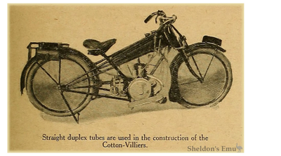 The first Cotton motorcycle was powered by a 2½ horsepower Villiers engine. It had a single-cylinder, two-stroke engine with a capacity of 269 cc (70 x 70 mm bore and stroke). The bike used drip-feed lubrication, an Amac carburettor, and a flywheel magneto for ignition. It was equipped with a two-speed Albion gearbox, with chain and belt drive. The tyres were Dunlop 26 x 2¼ inches.
